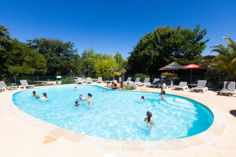 La piscine du Camping à Biscarrosse En Chon Les Pins, dans les Landes, avec ses paillottes, vous accueille dans un cadre agréable et paysagé. Au sein de l’espace aquatique de notre camping, petits et grands trouveront leur bonheur et pourront profiter des joies de la baignade dans la piscine extérieure en toute liberté. Vous avez exploré toute la journée les alentours du petit camping familial dans les Landes avec piscine : Bordeaux, la Dune du Pilat, les plages de l’Océan Atlantique ? Vous souhaitez vous rafraichir et vous jeter à l’eau à proximité du lac et des plages et profiter de l’eau à tout moment de la journée ? Notre espace aquatique à Biscarrosse dans le département des Landes est l’endroit idéal pour vos moments de détente et de bien-être, mais également pour y nager quelques longueurs.