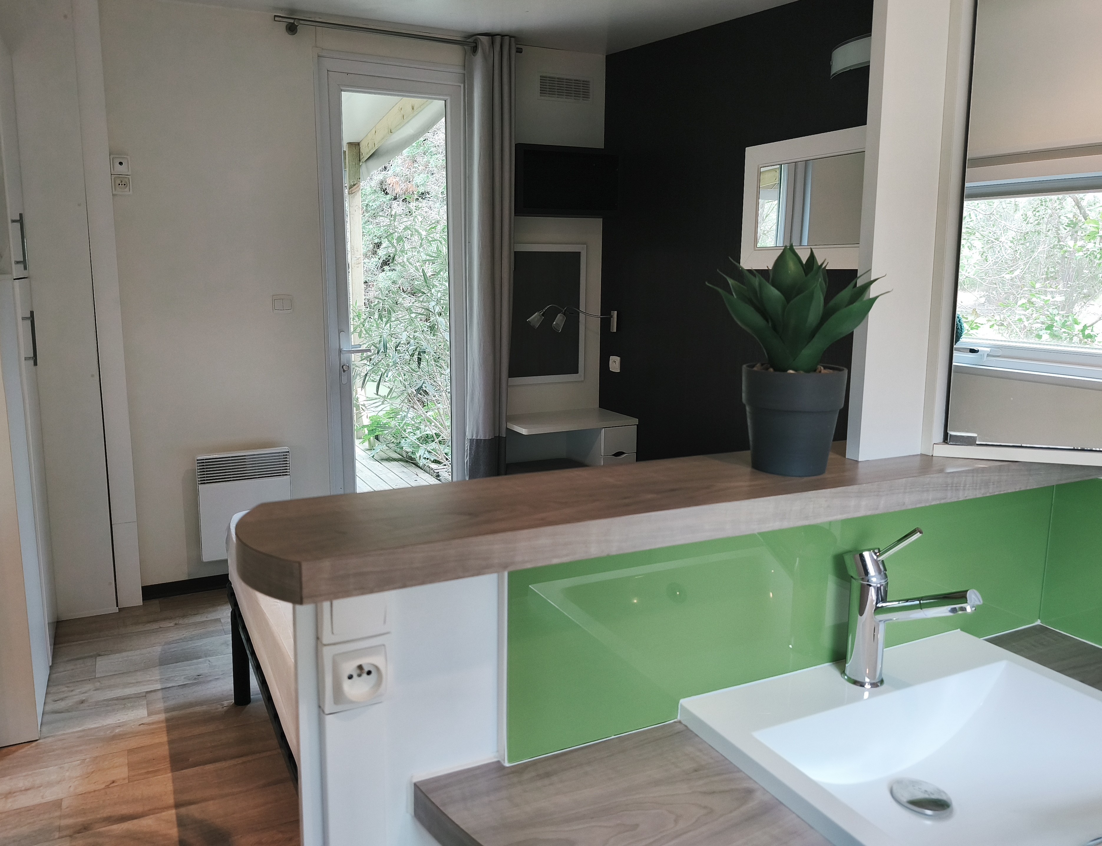 Optez pour notre Mobil home TAOS avec son agencement intérieur exceptionnel tout en pureté, doté de grands espaces, avec ses portes coulissantes, au design sobre innovant et épuré, tout en lumière et convivialité. Le luxe sur notre petit Camping 3 étoiles familial, à taille humaine dans les Landes.